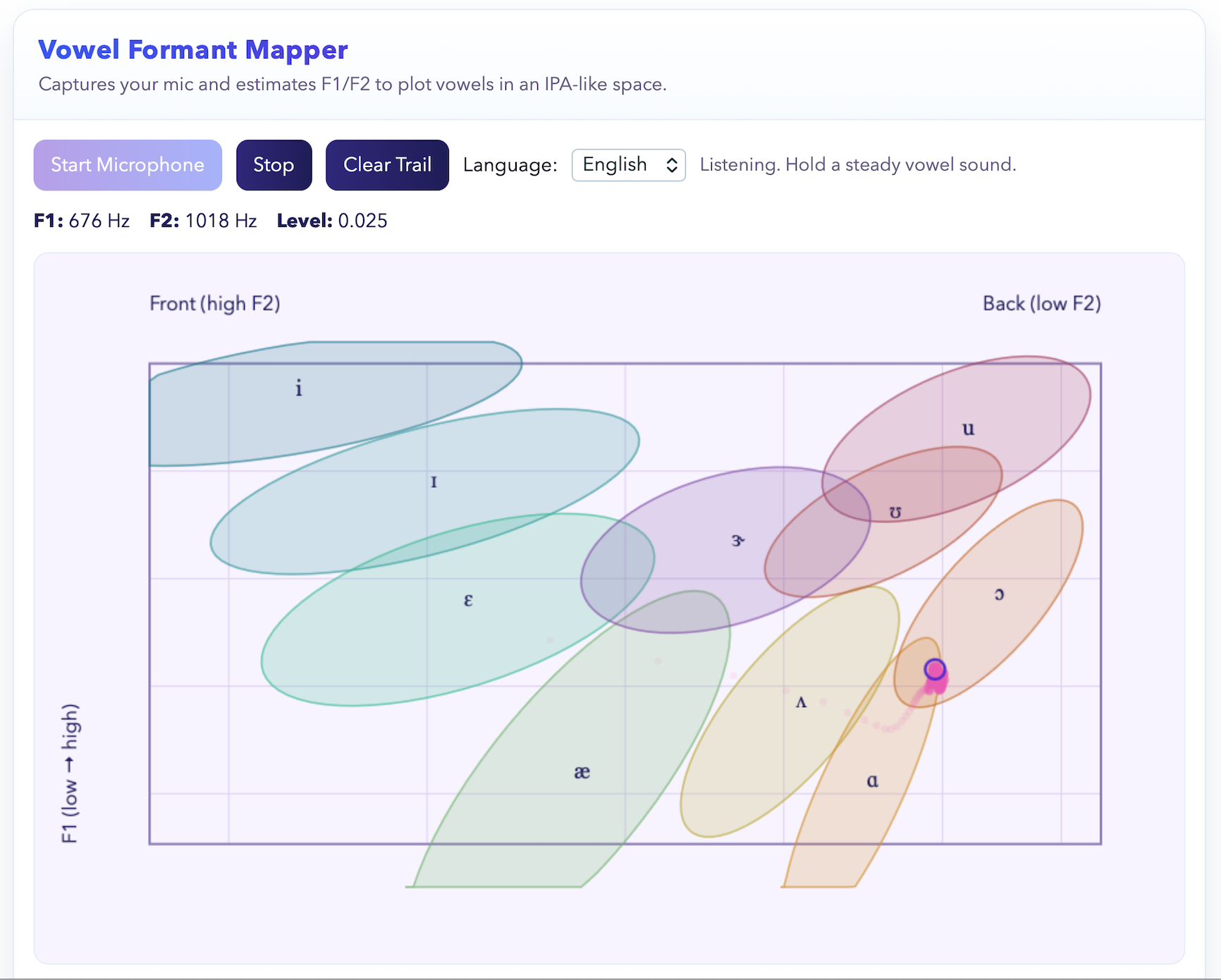 Years ago, I was intrigued by the vowel worm. It was a simple JavaScript web app (before the term "web apps" existed) that accessed the microphone to map vowels on a chart reminiscent of the IPA vowel diagram.
